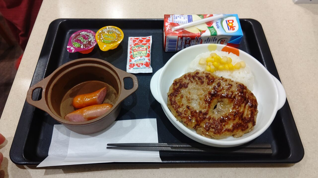 ハンバーグ・ソーセージ1/2カット2つ・ゼリー2個・アップルジュース・ごはん