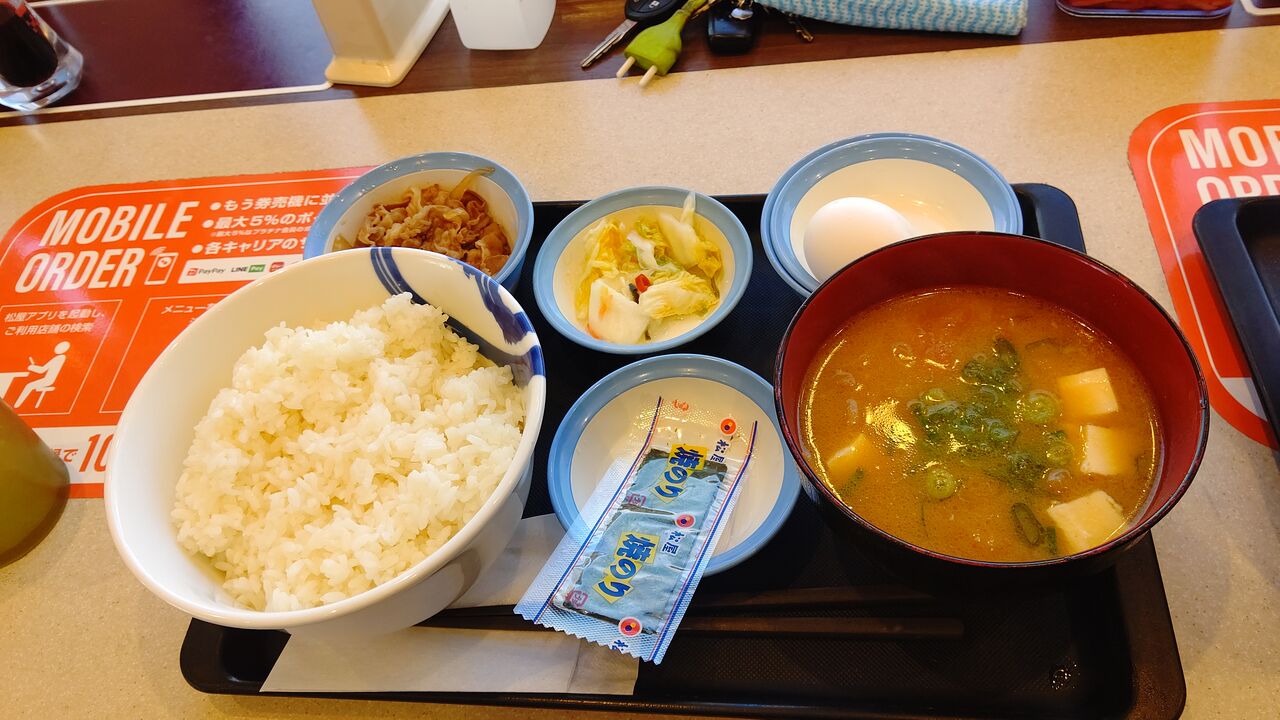 ごはん(特盛)+豚汁+生卵+漬物+焼き海苔+牛皿