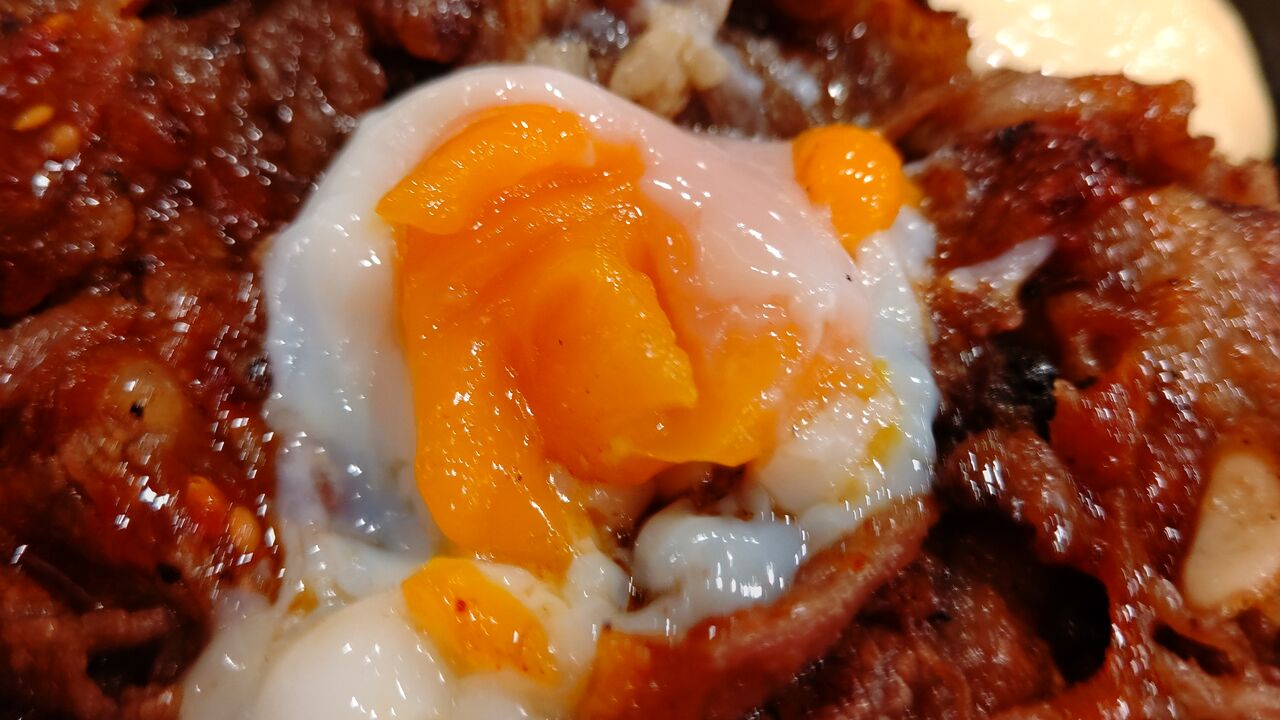 温玉とカルビ肉を絡めて食べると